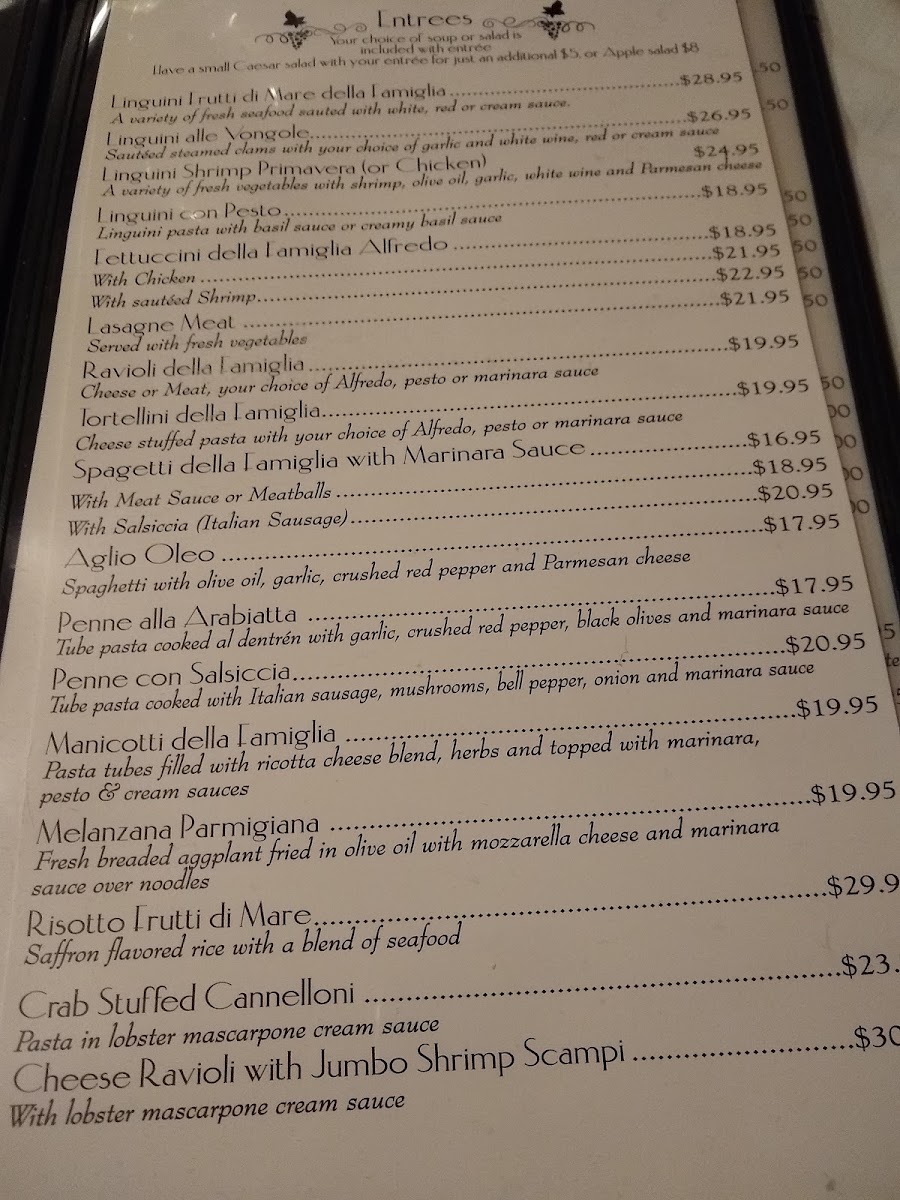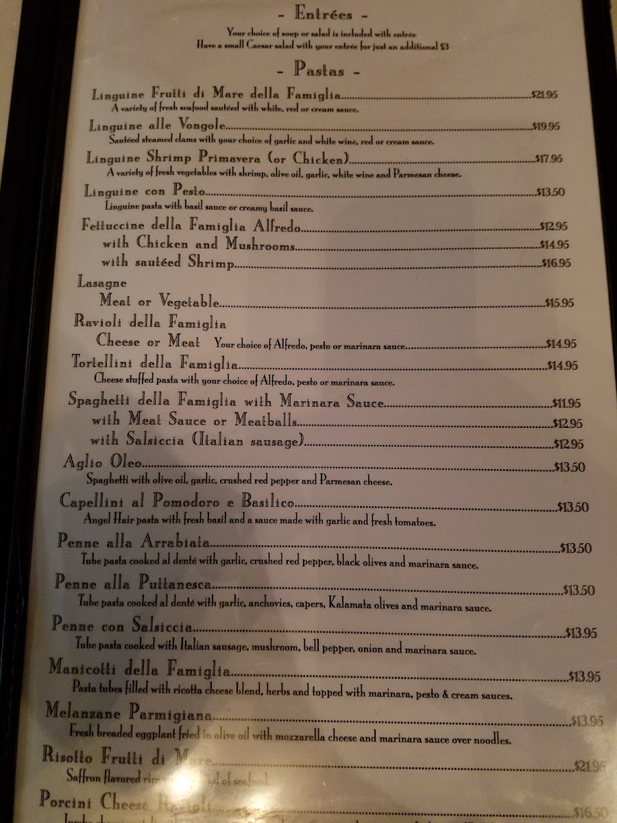 You’ll find a variety of pastas, from rich and creamy Fettuccini Alfredo to seafood-forward dishes like Linguini Futti di Mare della Famiglia. Entrées like Vitello Scallopine Marsala and Chicken Piccata provide hearty, well-balanced options that pair naturally with a glass of wine or a simple espresso to finish the meal. Lighter fare such as Minestrone soup or Bruschetta offer fresh, inviting starters that ease you into the rest of the meal.